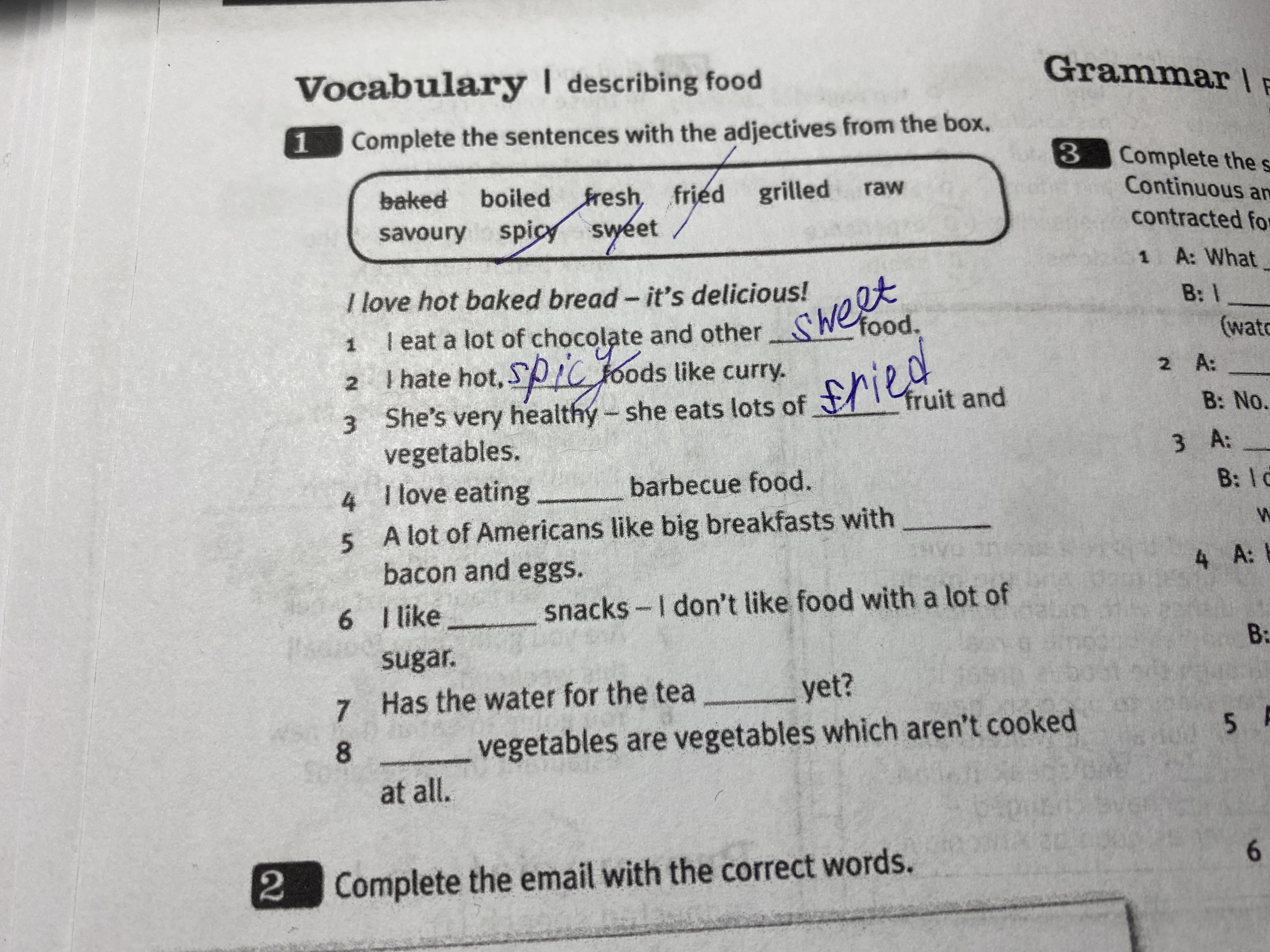 Compete the sentences with the adjectives from the box: baked,boiled,fresh ,fried,grilled,raw , savoury , spicy,sweet