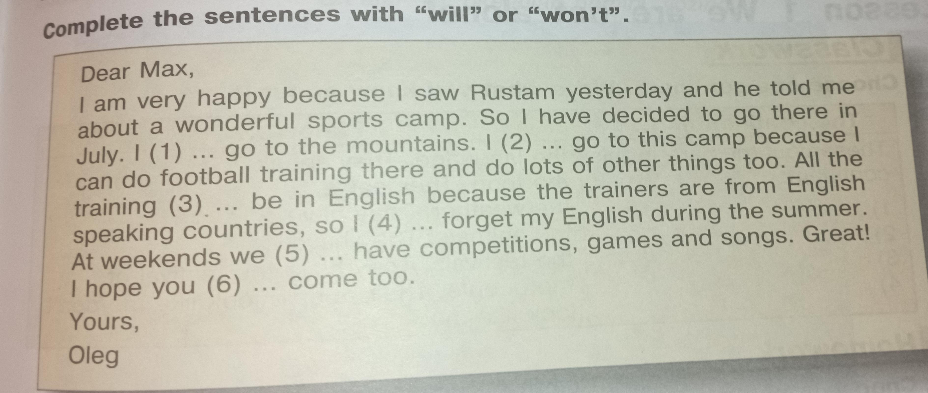 1) won't 2) will 3) will 4) won't 5) will 6) will