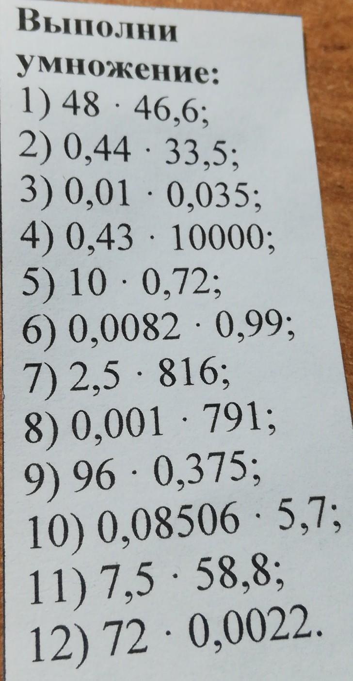 . Выполни Умножение: 1) 48 · 46,6; 2) 0,44 · 33,5; 3) 0,01 · 0,035; 4) 0,43 · 10000; 5) 10 · 0,72; 6) 0,0082 · 0,99; 7) 2,5 · 816; 8) 0,001 · 791; 9) 96 · 0,375; 10) 0,08506 · 5,7; 11) 7,5 · 58,8; 12) 72 · 0,0022.
