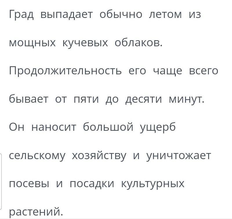 Град(сущ.) выпадает(глаг.) обычно(нареч.) летом(сущ.) мощных(прил.) кучевых(прил.) облаков(сущ.)