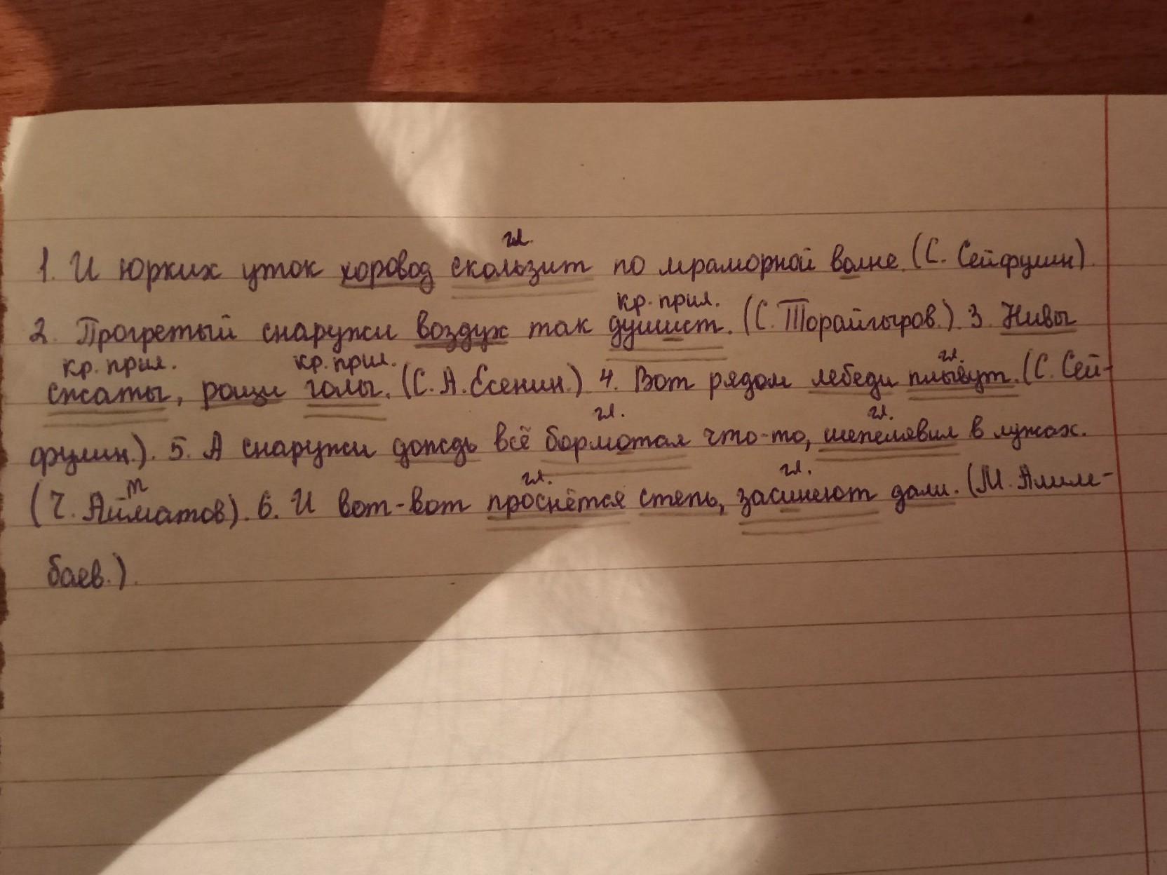 386A. Спиши предложения, вставляя пропущенные бук- вы. Подчеркни грамматическую основу предложений. Укажи чем выражено сказуемое 1. И юрких" уток хоровод ск...льзит по мра- мрамор морной в...лне. (С. Сейфуллин) 2. Прогретый снаружи воздух так душ...ст. (С. Торайгыров) 3. Нивы" сжаты, рощи голы. (С. А. Есенин) 4. Вот рядом лебеди плывут. (С. Сейфуллин) 5. А снаружи дождь всё борм...тал что-то, ше- пелявил в лужах. (Ч. Айтматов) 6. И вот-вот проснётся степь, зас...неют дали. (М. Алимбаев)