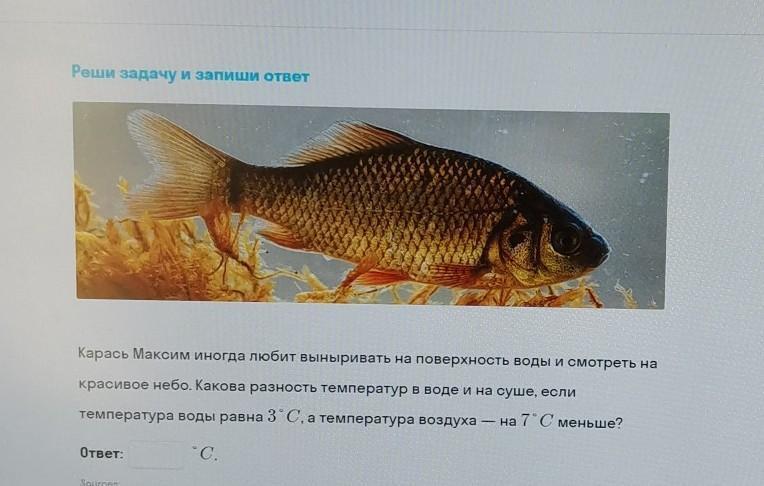 карась Максим иногда любит выныривает на поверхность и смотреть на красивое небо Какова разность температура в воде и на суше если температура воды равна 3 градусов Цельсия а температура воздуха на 7 градусов Цельсия меньше??? Пжжжж дай 85 баллов
