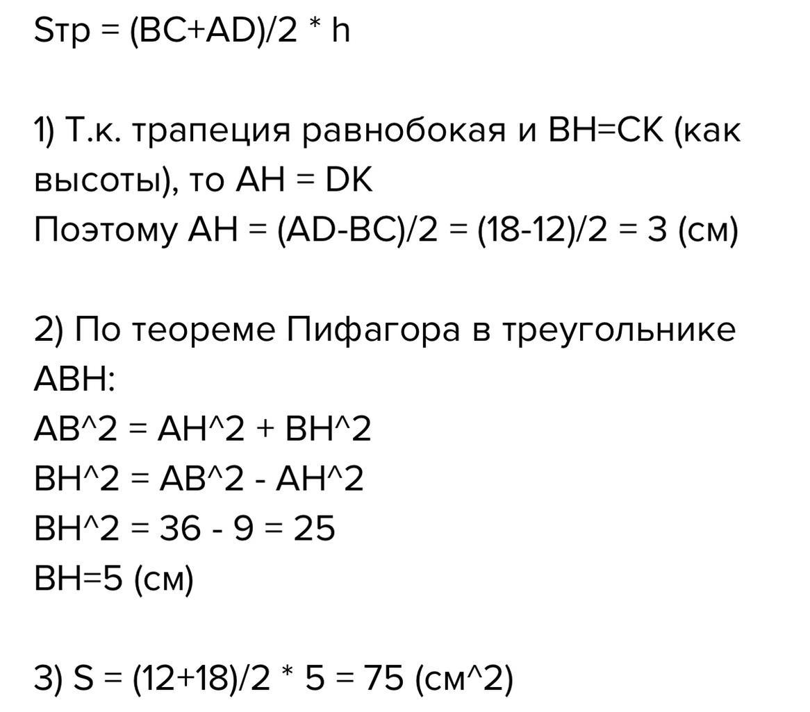 Найдите площадь равнобокой трапеции, основания которой равна 12 см и 18 см,а боковая сторона равна 6