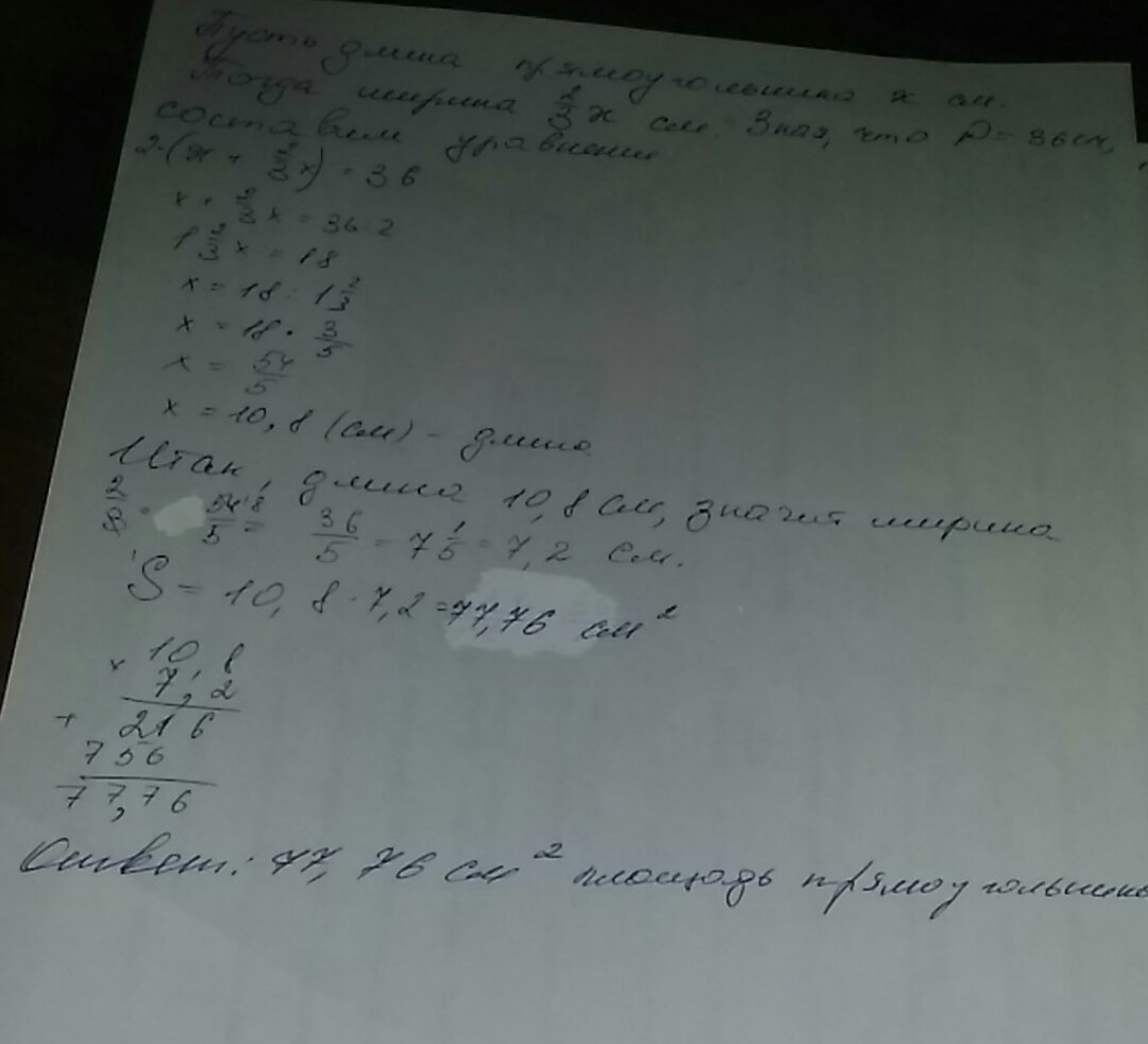 Чему равна площадь прямоугольника, если его ширина составляет 2/3 длины, а периметр равен 36 см?