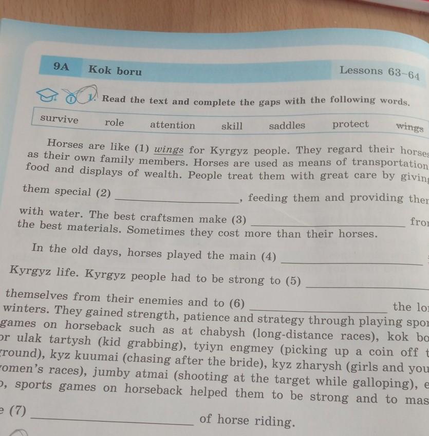 Read the text and complete the gaps with the following words. protect wings saddles survive role attention skill d) D Horses are like (1) wings for Kyrgyz people. They regard their horses as their own family members. Horses are used as means of transportation, food and displays of wealth. People treat them with great care by giving them special (2) feeding them and providing them from with water. The best craftsmen make (3) the best materials. Sometimes they cost more than their horses. in In the old days, horses played the main (4) Kyrgyz life. Kyrgyz people had to be strong to (5) the long themselves from their enemies and to (6) winters. They gained strength, patience and strategy through playing sports games on horseback such as at chabysh (long-distance races), kok boru or ulak tartysh (kid grabbing), tyiyn engmey (picking up a coin off the ground), kyz kuumai (chasing after the bride), kyz zharysh (girls and young women's races), jumby atmai (shooting at the target while galloping), etc. So, sports games on horseback helped them to be strong and to master the (7) of horse riding.