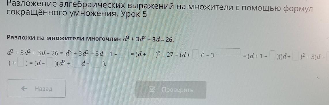 d³+3d²+3d-26=d³+3d²+3d+1-27=(d+1)³-27=(d+1)³-3³=(d+1-3)((d+1²+3(d+1)+9)(d-2)(d²+2d+1+3d+3+9)=(d-2)(d²+5d+13)