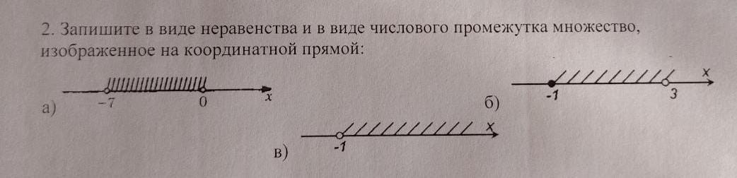 2. Запишите в виде неравенства и в виде числового промежутка множество, изображенное на координатной прямой: а) -7 0 б)-1 х в) -1 3