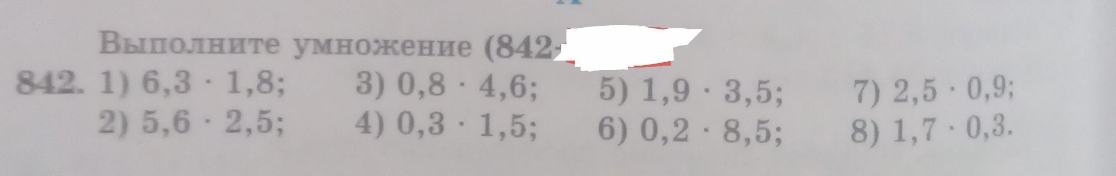 Выполните умножение в столбик (842 842. 1) 6,3 - 1,8; 3) 0,8 · 4,6; 5) 1,9 3,5; 2) 5,6 - 2,5; 4) 0,3-1,5; 6) 0,2 · 8,5; 7) 2,5 0,9; 8) 1.7.0.3