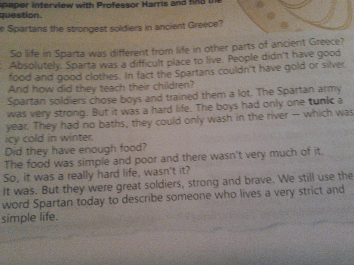 Итак,жизнь в Спарте была другой чем в других частях древней Греции?Безусловно.Спарта была нелегким местом для проживания.Люди не имели достаточно еды,плохо одевались.Фактически спартанцы не имели ни серебра,ни золота.А как же они учили детей?Спартанские солдаты выбирали парней и много их тренировали.Спартанская армия была очень сильной.Но эта была тяжелой жизнью.Парни не могли сходить в баню,только имели возможность искупаться в речке,которая была ледяная зимой.Достаточно ли еды было у них?Еда была простой и скудной,и её была не очень много.Итак,эта реально тяжелая жизнь,не так ли?Да,так и есть.Но они были великими солдатами,сильными и храбрыми.Мы до сих пор используем слово Спартанец в наши дни,чтобы дать эту характеристику,кто живет очень строгой и простой жизнью.