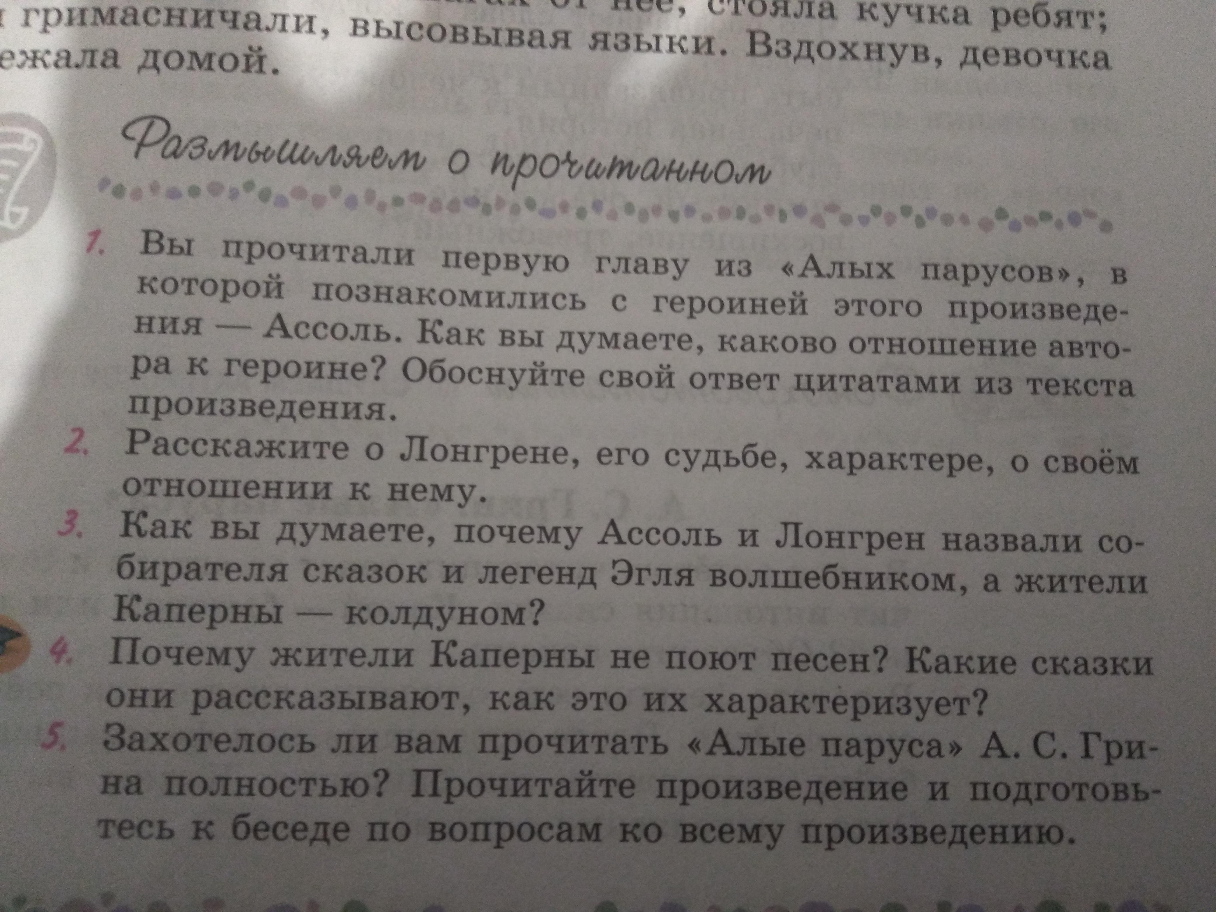 «Ассоль было уже пять лет, и отец начинал всё мягче и мягче улыбаться, посматривая на её нервное, доброе личико, когда, сидя у него на коленях, она трудилась над тайной застегнутого жилета или забавно напевала матросские песни — дикие ревостишия.»