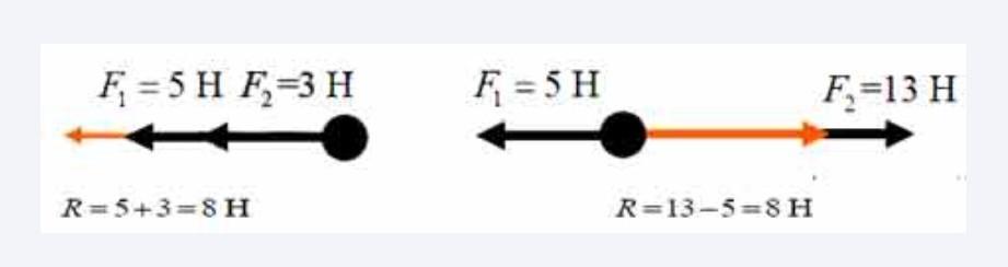 2. силы направлены в разные стороны: 13Н-5Н=8Н