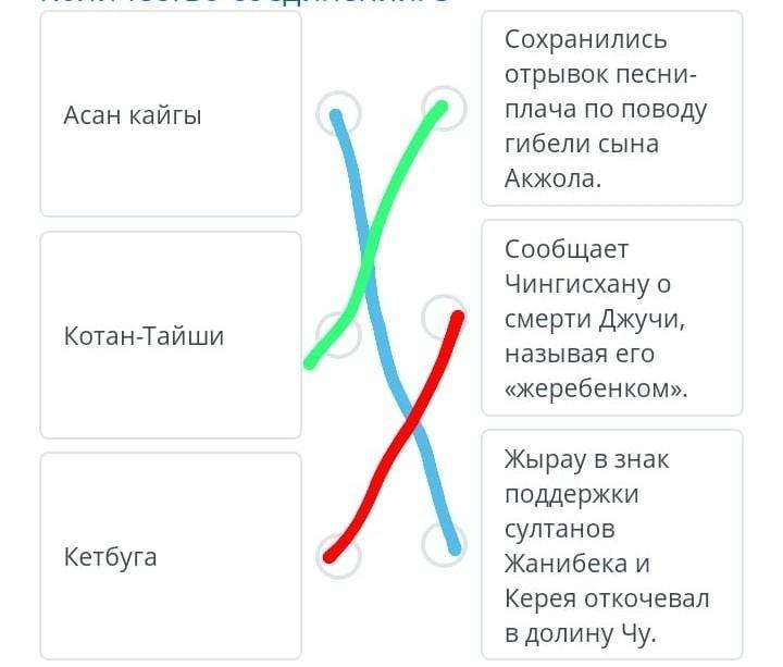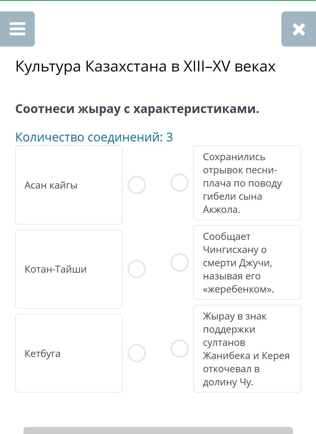 Культура Казахстана в XIII–XV веках Соотнеси жырау с характеристиками. Количество соединений: 3 Асан кайгы Котан-Тайши Кетбуга Сохранились отрывок песни-плача по поводу гибели сына Акжола. Сообщает Чингисхану о смерти Джучи, называя его «жеребенком». Жырау в знак поддержки султанов Жанибека и Керея откочевал в долину Чу. Назад Проверить