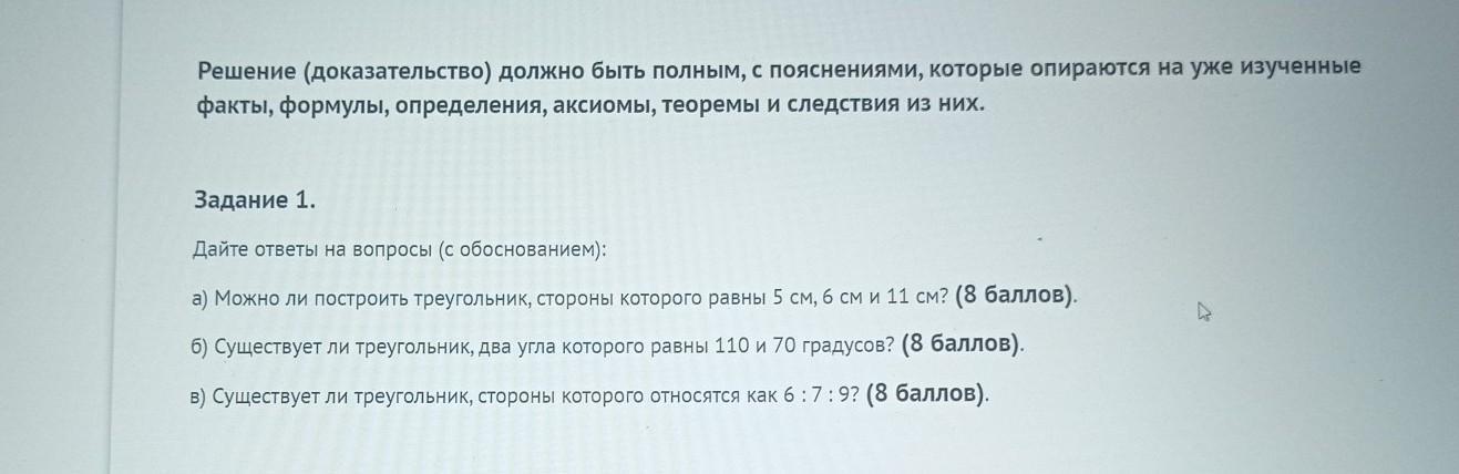 Задание 1. Дайте ответы на вопросы (с обоснованием): а) Можно ли построить треугольник, стороны которого равны 5 см, 6 см и 11 см? (8 баллов). б) Существует ли треугольник, два угла которого равны 110 и 70 градусов? (8 баллов). в) Существует ли треугольник, стороны которого относятся как 6:7:9? (8 баллов). www