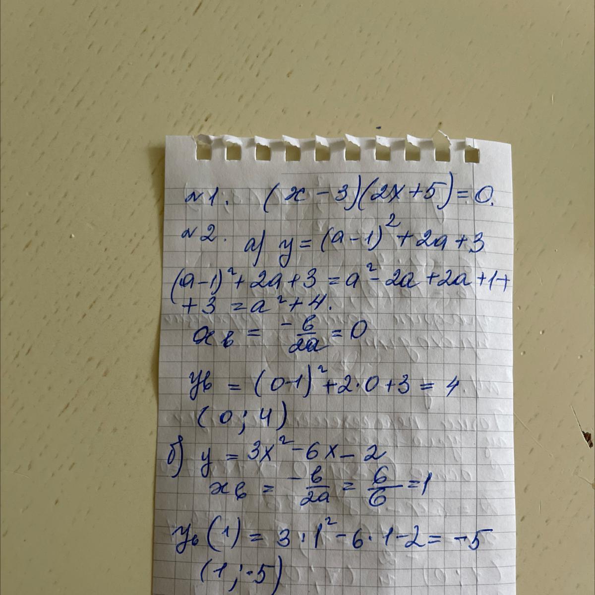 16 Самостоятельная работа «Квадратичная функция. График квадратичной функции» а! 2 вариант 1. Запишите свой пример квадратичной функции, записанной в виде разложения на множители. 2. Найдите координаты вершины параболы: а) у = (а — 1)2 + 2 + 3; б) у = 3x 2 – бх — 2. 3. Проходит ли график функции y = 4(х + 1)2 через точку М (-3;16)? 4.Найдите координаты точек пересечения параболы с осями координат у = -х? + 8х - 7. 5.Постройте график функции: у= 2х2 – 8х +6.