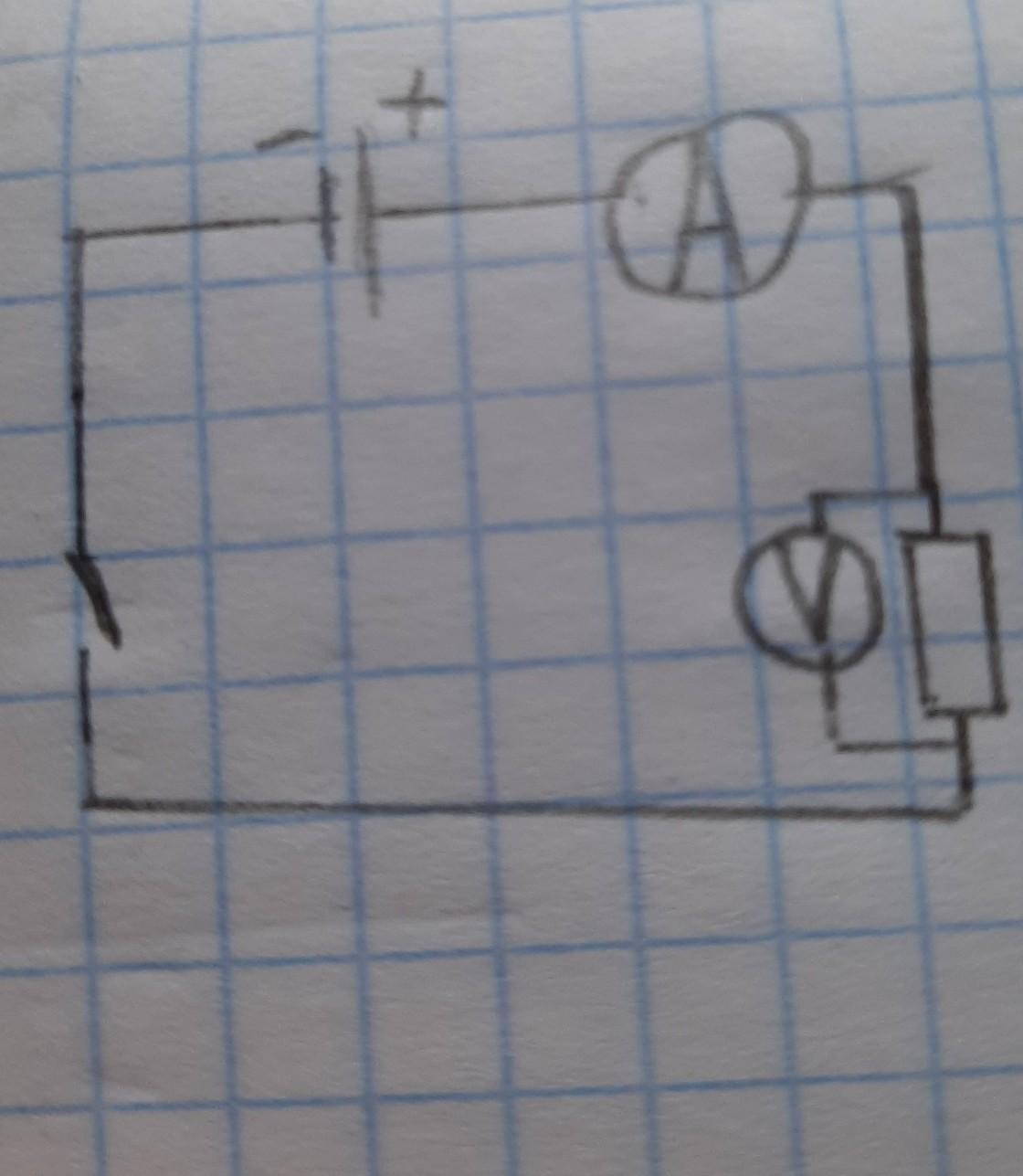 3. В электрической цепи последовательно при помощи проводов соединены следующие приборы: - гальванический элемент, - резистор - Ключ. А также измерительные приборы амперметр и вольтметр, которые измеряют силу тока и напряжение резистора. Используя условные обозначения, нарисуйте схему данной электрической цепи. Используйте для этого карандаш и линейку.