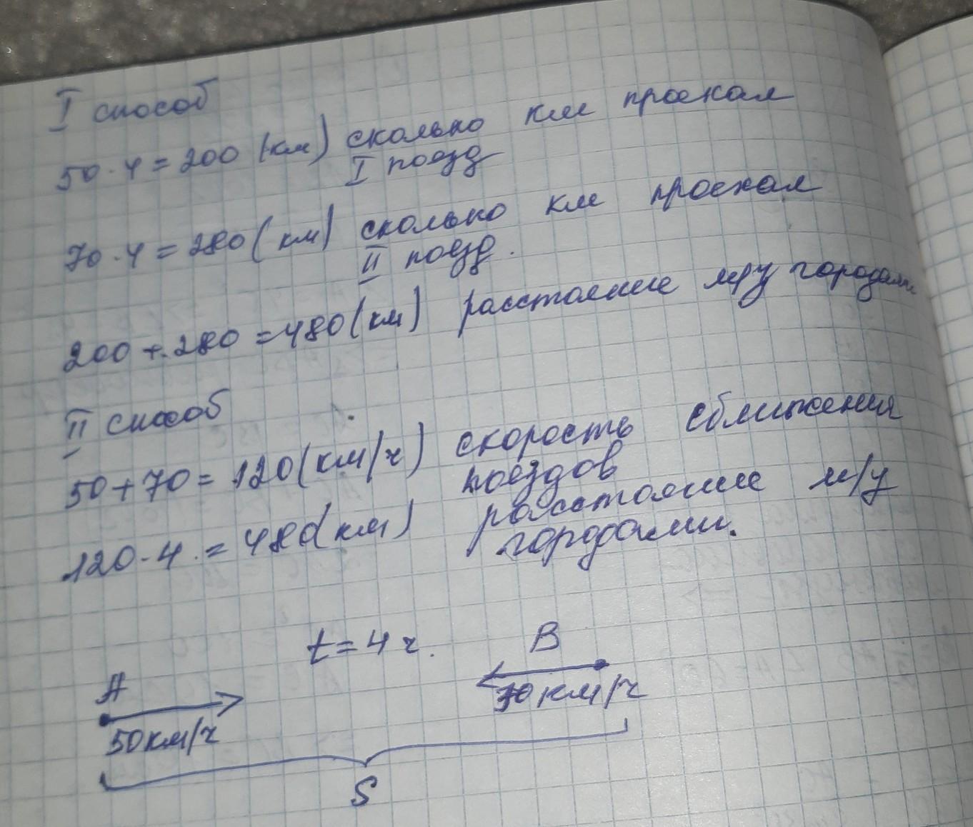 Из двух городов одновременно вышли на встречу друг другу два поезда,которые встретились через 4ч.Скорость одного поезда 50 км/ч,скорость другого-70 км/ч.Найди расстояние между городами.