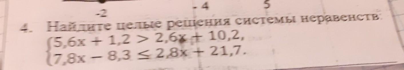 -2 4. Найдите целые решения системы неравенств: (5,6х + 1,2 > 2,6х + 10,2, .. 17,8х - 8,3 < 2,8х + 21,7. ребята помогите мне пожалуйста