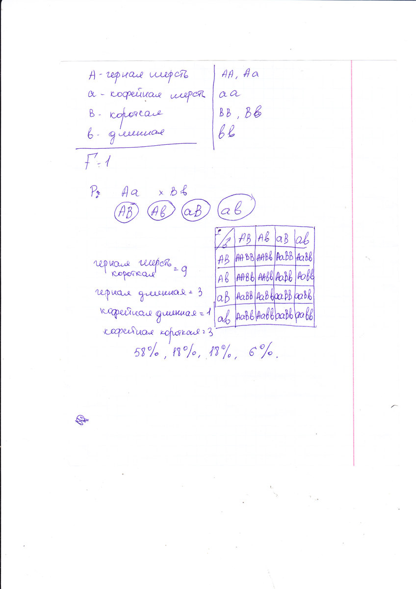 У собак черный цвет шерсти доминирует над кофейным, а короткая шерсть над длинной. Какой процент чёрных короткошёрстых щенят можно ожидать от скрещивание двух особей , гетерозиготных во обоим признакам ? Как определить, несёт ли гены кофейного цвета и длинной шерсти чёрная короткошерстая собака? Какого партнёра по фенотипу и генотипу надо брать для скрещивание доя данной проверки?