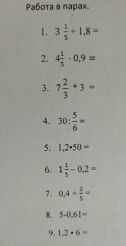 1. 3 1/5 + 1, 8 = 2. 4 1/5 * 0, 9 = 3. 7 2/3 * 3 = 4. 30 / (5/6) = 5. 1, 2 * 50 = 6. 1 1/5 - 0, 2 = 7. 0, 4 + 2/5 = 8. 5 - 0, 61 = 9. 1, 2 * 6 =