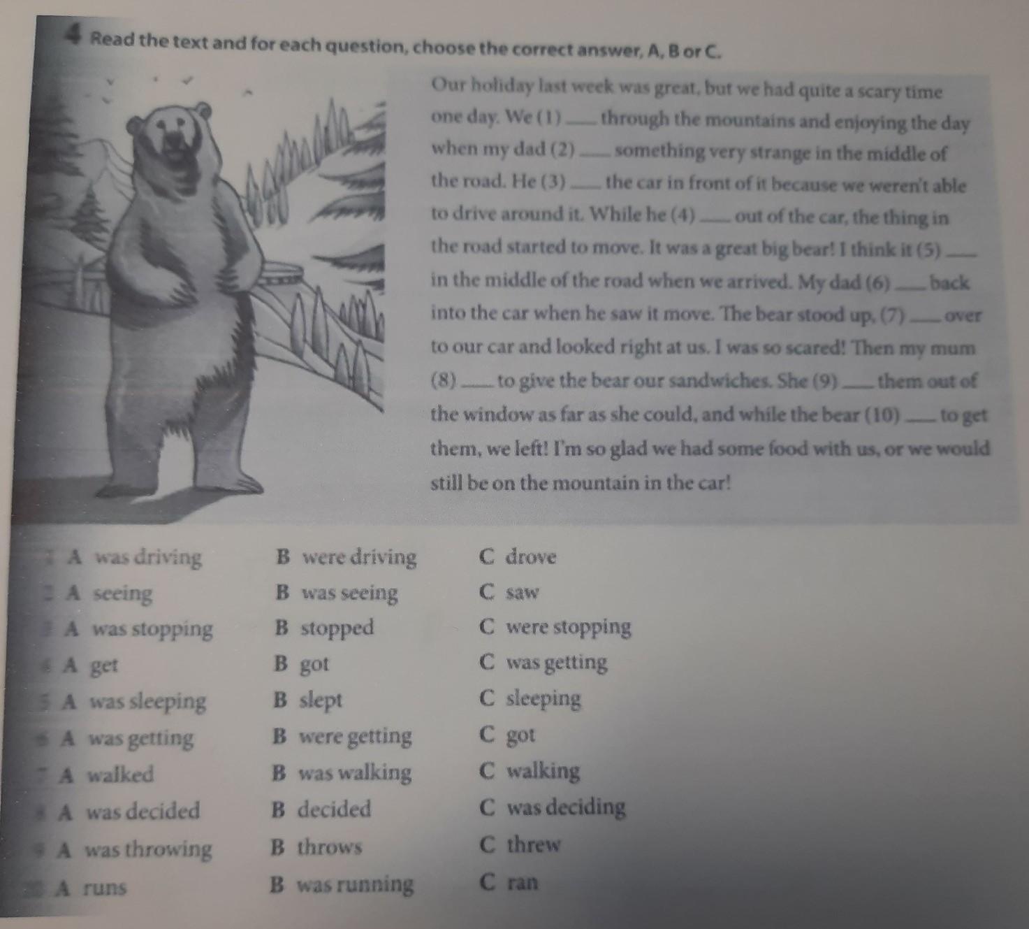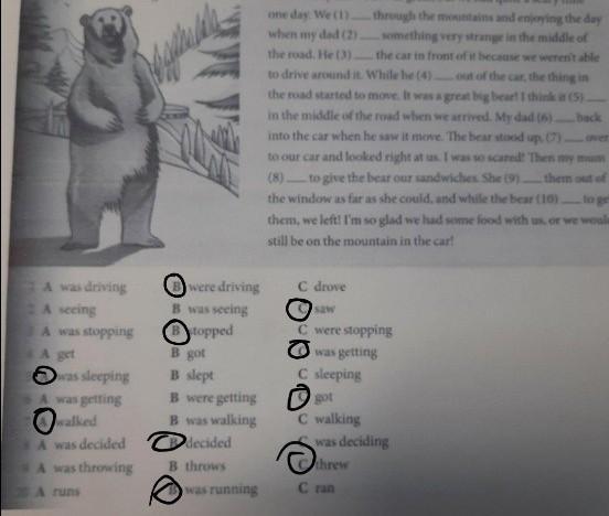 2.saw 3.stopped 4.was getting 5.was sleeping 6.got 7.walked 8.decided 9.threw 10. was running