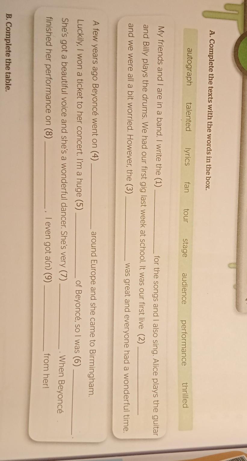 4.tour 5.fan 6.thrilled 7.talented 8.audience 9.autograph