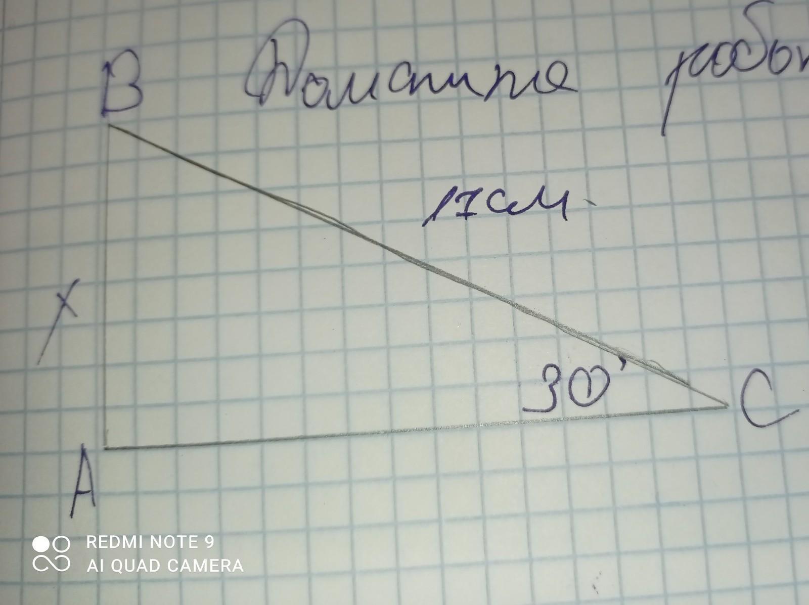 Сторона лежащая на против угла в 30° равна половине гипотенузы => x = 17/2 = 8,5 см.