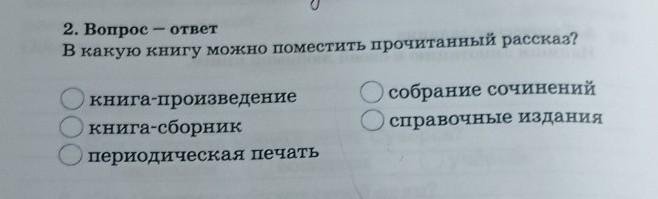 В какую книгу можно поместить прочитанный рассказ? 1)книга-произведение 2)книга-сборник 3)периодическая печать 4)собрание сочинений 5)справочные издания