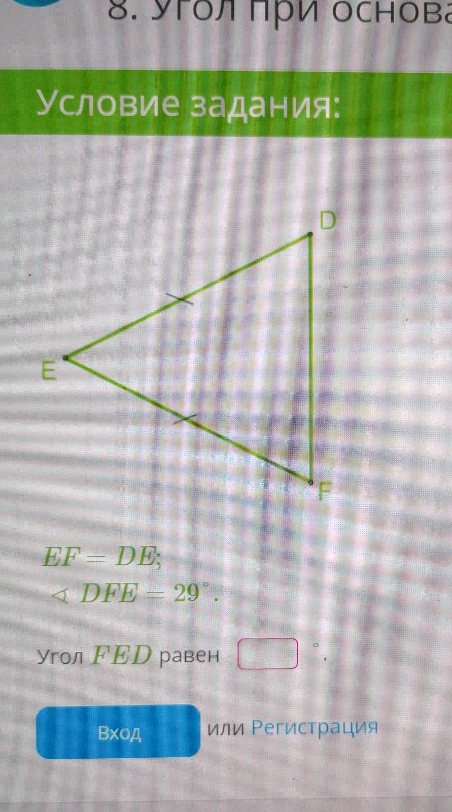 По свойству равнобедренного треугольника, углы при основании равны, то угол DFE = EDF; EDF = 29.