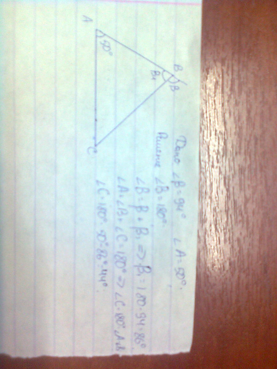 В треугольнике ABC угол А=50 градусам,внешний угол при вершине B=94 градуса.Найдите градусную меру угла С. (заранее спасибо)