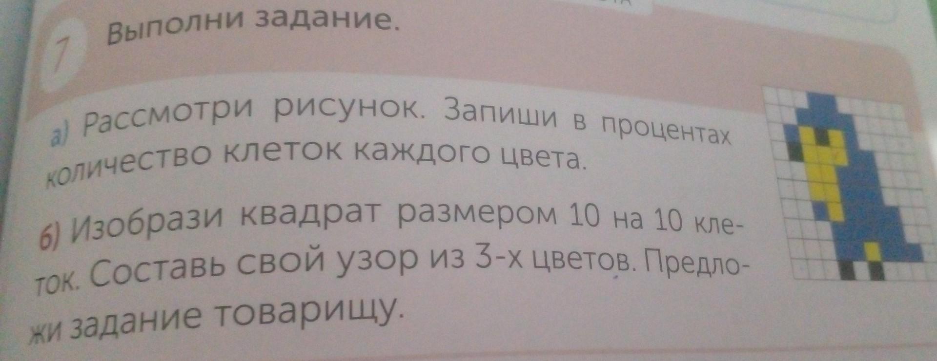 (а) Рассмотри рисунок. Запиши в процентах количество клеток каждого цвета.