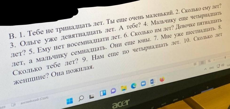 21:04 F. 1. Sie sind nicht dreizehn Jahre alt. Du bist noch sehr klein. 2. Wie alt ist er? 3. Olga ist bereits neunzehn Jahre alt. Und dir? 4. Ist der Junge noch vierzehn Jahre alt? 5. Er ist nicht achtzehn Jahre alt. 6. Wie alt sind sie? Das Mädchen ist fünfzehn Jahre alt und der Junge ist siebzehn. Sie sind noch jung. 7. Ich bin schon sechzehn, 8. Wie alt bist du? 9. Wir sind immer noch vierzehn Jahre alt. 10. Wie alt ist die Frau? Sie ist älter. acer SCHLIESSEN