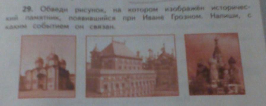 29. Обведи рисунок, на котором изображён историчес- кий памятник, появившийся при Иване Грозном. Напиши, с каким событием он связан. .