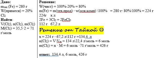 При взаимодействии железа с хлором образуется хлорид железа ( III ). Рассчитайте количество вещества, массу и объём ( н.у. ) хлора, который потребуется для взаимодействия с 280 г железа, содержащего 20% примесей?
