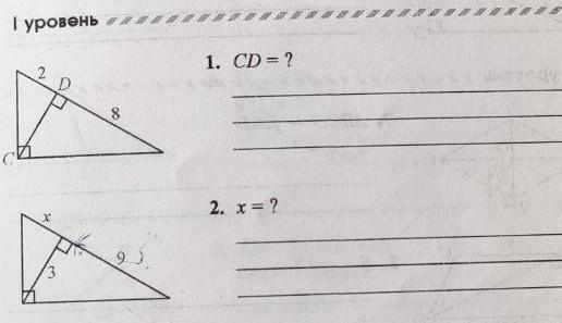 1. CD - высота, делит гипотенузу -> CD = ✓2*8 = 4