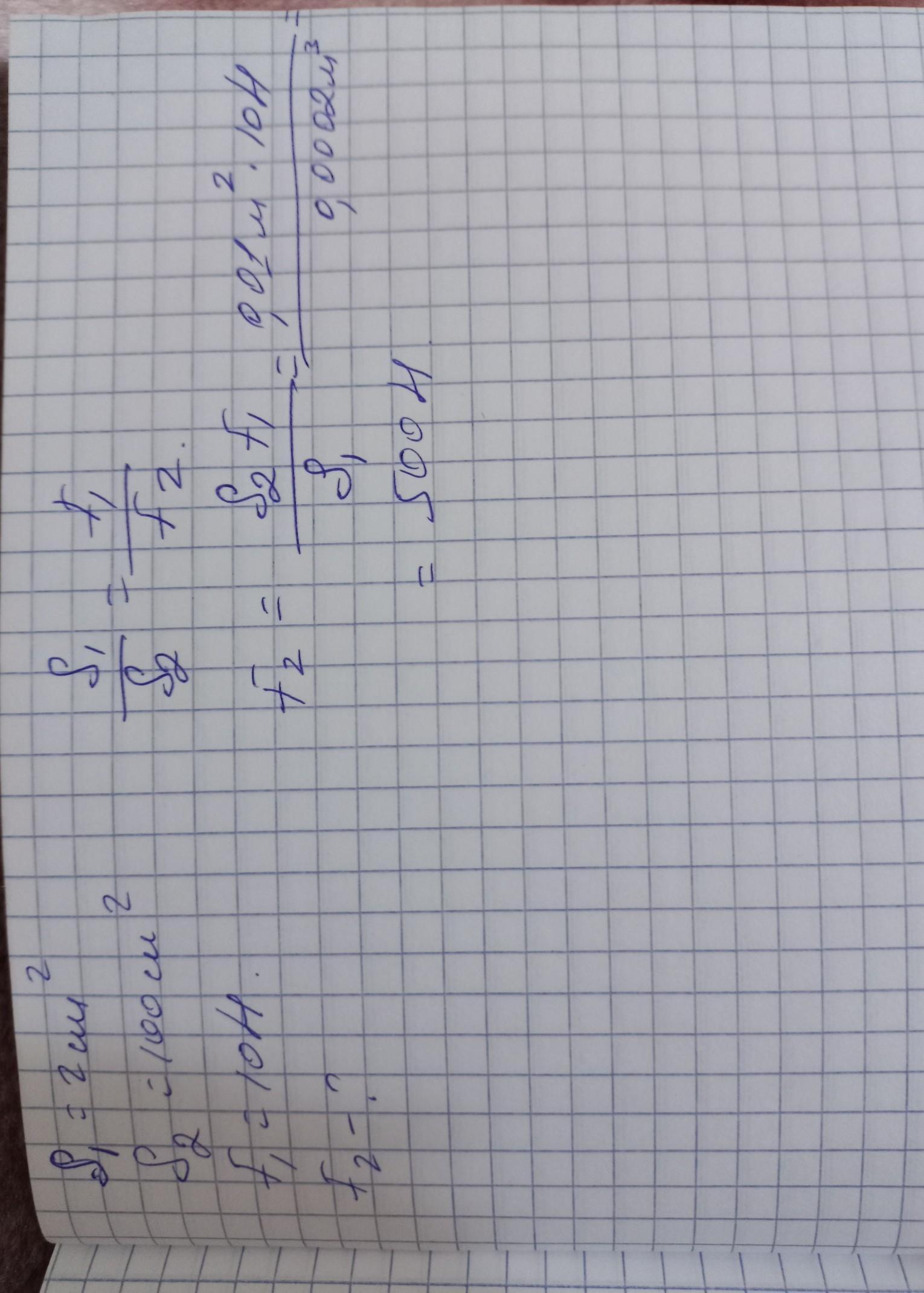 В гидравлическом прессе площадь малого поршня 2 см², большого – 100 см². На малый поршень действуют силой 10 Н. Какая сила при этом возникает на большом поршне?