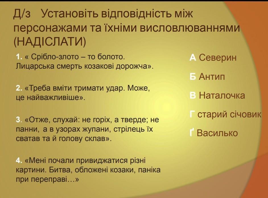 3. Отже слухай: не горіх... - Антип (Б) цитата: – Отже слухай: не горіх, а тверде; не панни, а в узорах жупани; стрілець їх сватав, та й голову склав. Не забудь: брехатимеш довіку! – глузливо хихикнув Антипко, ще раз вклонився і ... щез.