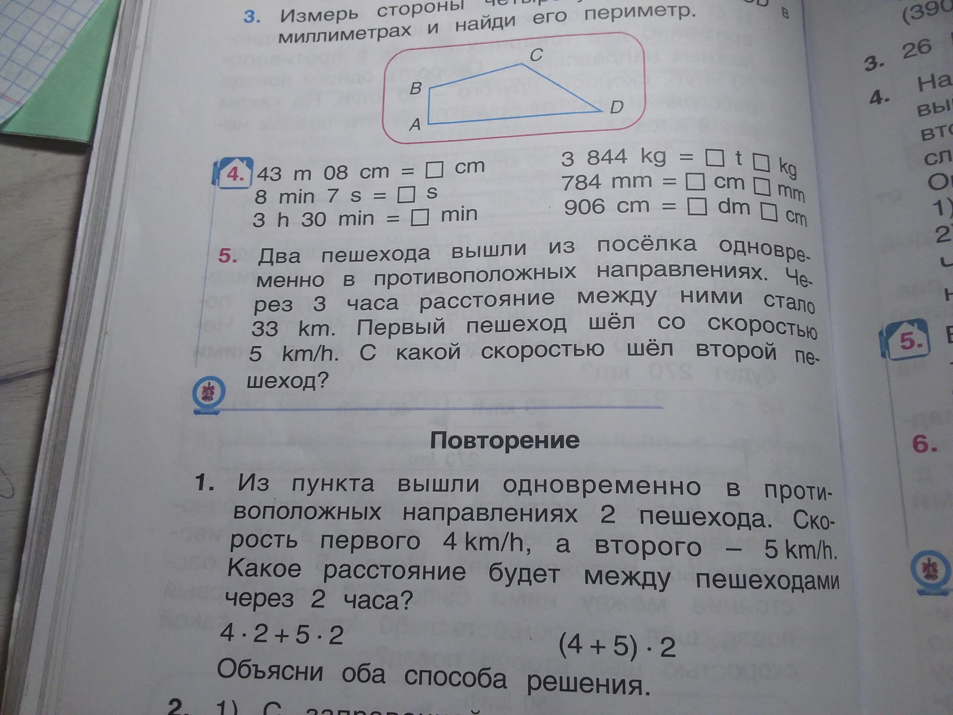 1 способ решения : 4 * 2 + 5 * 2. Автор способа сначала узнает сколько прошел первый пешеход (4 * 2) а затем сколько прошел второй пешеход (5 * 2) и ответ складывает. Это верное решение, Расстояние будет 18 км.