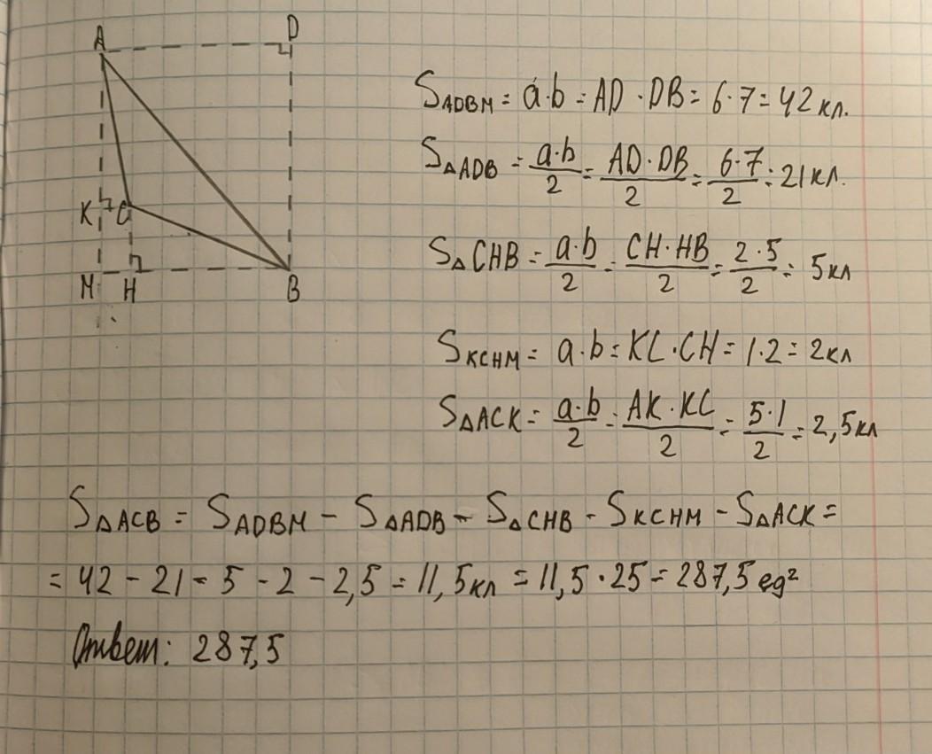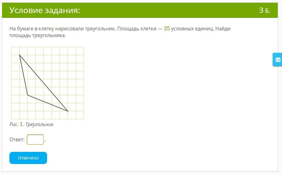 На бумаге в клетку нарисовали треугольник. Площадь клетки - 25 условных едениц. Найди площадь треугольника