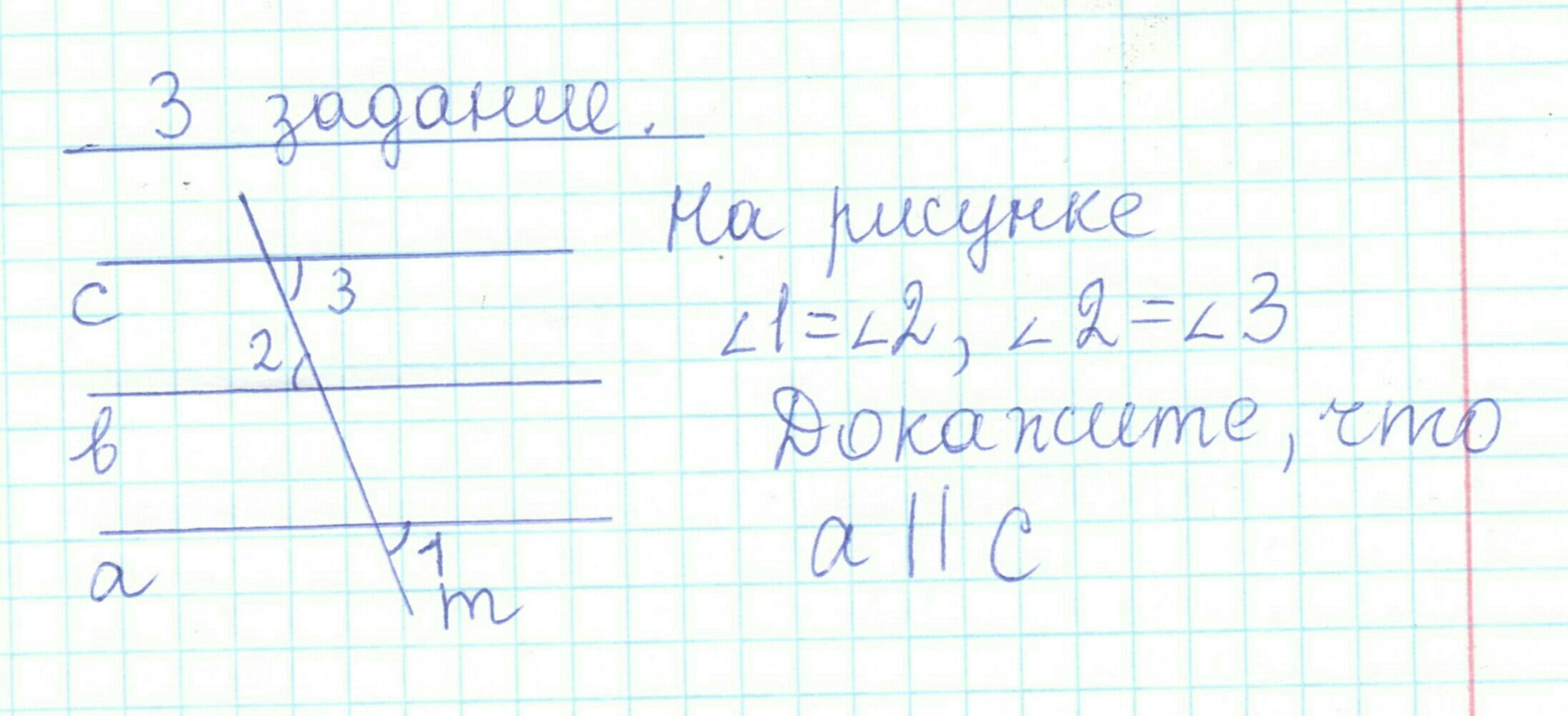 тут неграмотно построена задача ,но тем не менее ,тк угол 1 равен углу 2 ,а угол два углу 3 ,следует ,что угол 1 равен углу 3 ,они же соответственные ,делаем вывод прямые параллельны