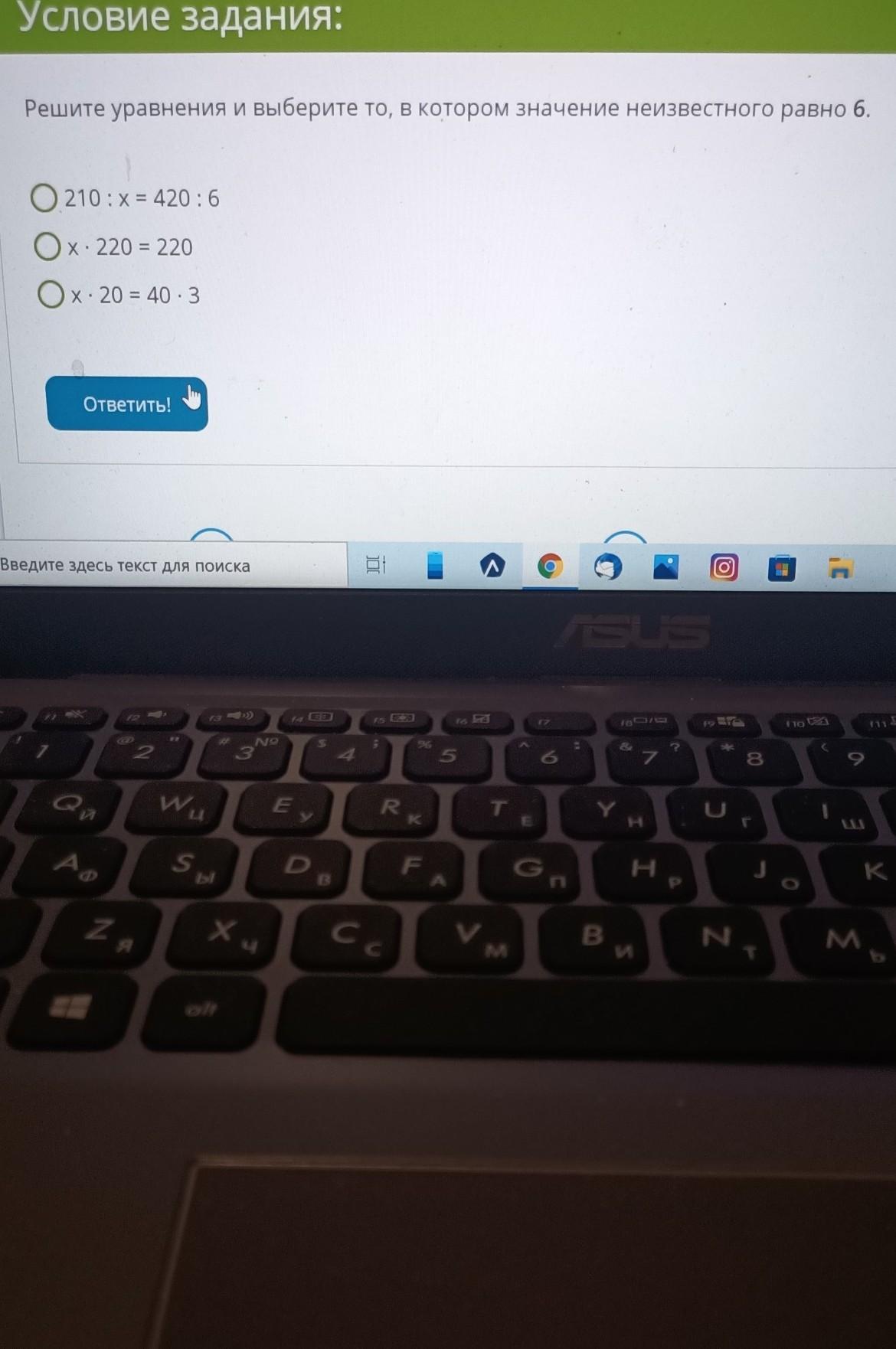 Решите уравнения и выберите то, в котором значение неизвестного равно 6. 210:х= 420:6 х: 220 = 220 Ох- 20 = 40 - 3. срочно!!!