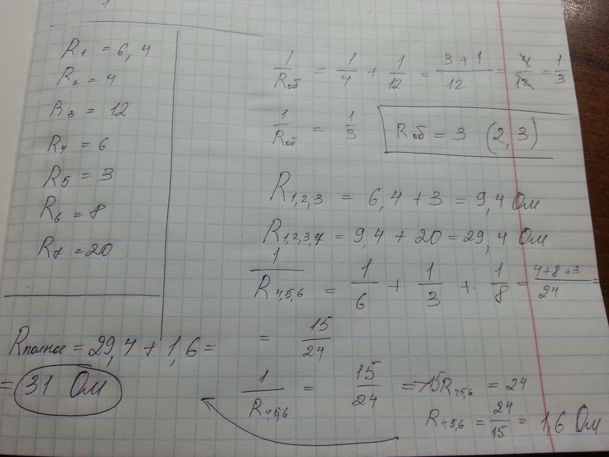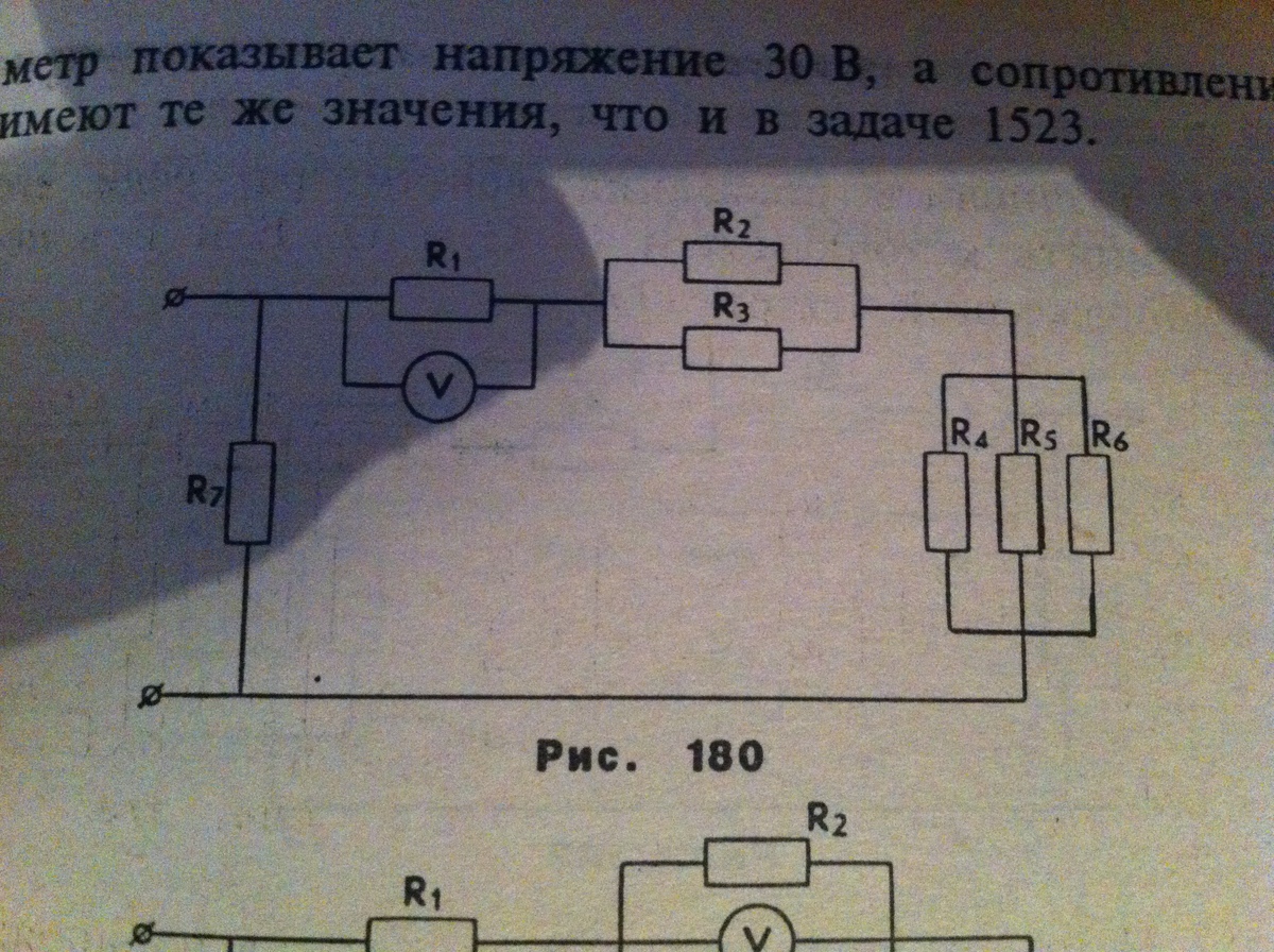 Т. к. первое сопротивление стоит параллельно вольтметру, то можем посчитать силу тока I=U/R => 32/6,4=5 А.