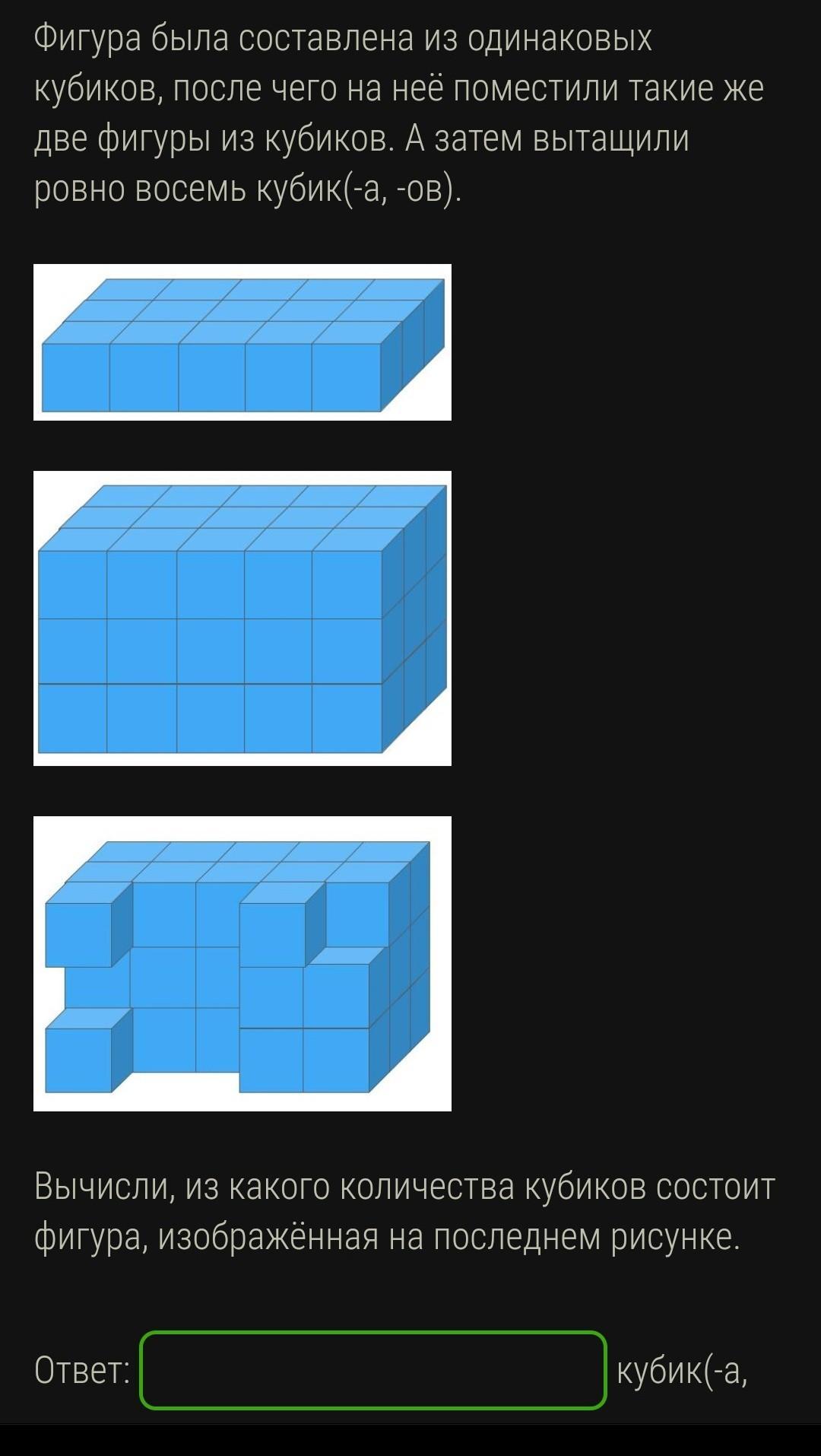 Фигура на первой картинке содержит 15 кубиков. На второй картинке два раза добавили столько же кубиков, то есть их стало в 3 раза больше, 15*3=45. На третьей картинке из 45 кубиков вытащили 8. 45-8=37.