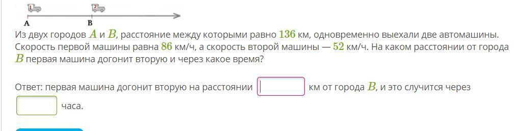 A B Из двух городов А и В, расстояние между которыми равно 136 км, охали две автомашины. Скдновременно выеорость первой машины равна 86 км/ч, а скорость второй машины - 52 км/ч. На каком расстоянии от города В первая машина догонит вторую и через какое время? Ответ: первая машина догонит вторую на расстоянии км от города В, и это случится через часа.