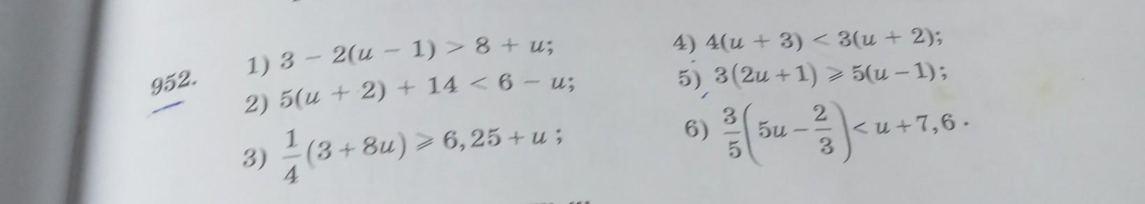 4. 952. 1) 3 - 2(u - 1) > 8 +u; 2) 5(u+2) + 14 < 6 - u; - 4) 4(u + 3) = 3(u + 2); 5) 3(2u +1) > 5(u - 1); 3 2 5u 6,25+u; 4 6) ( -