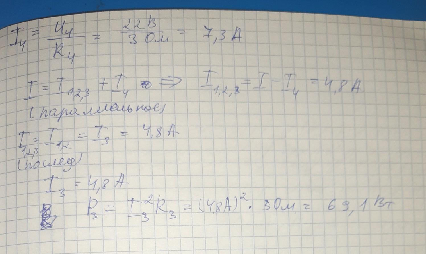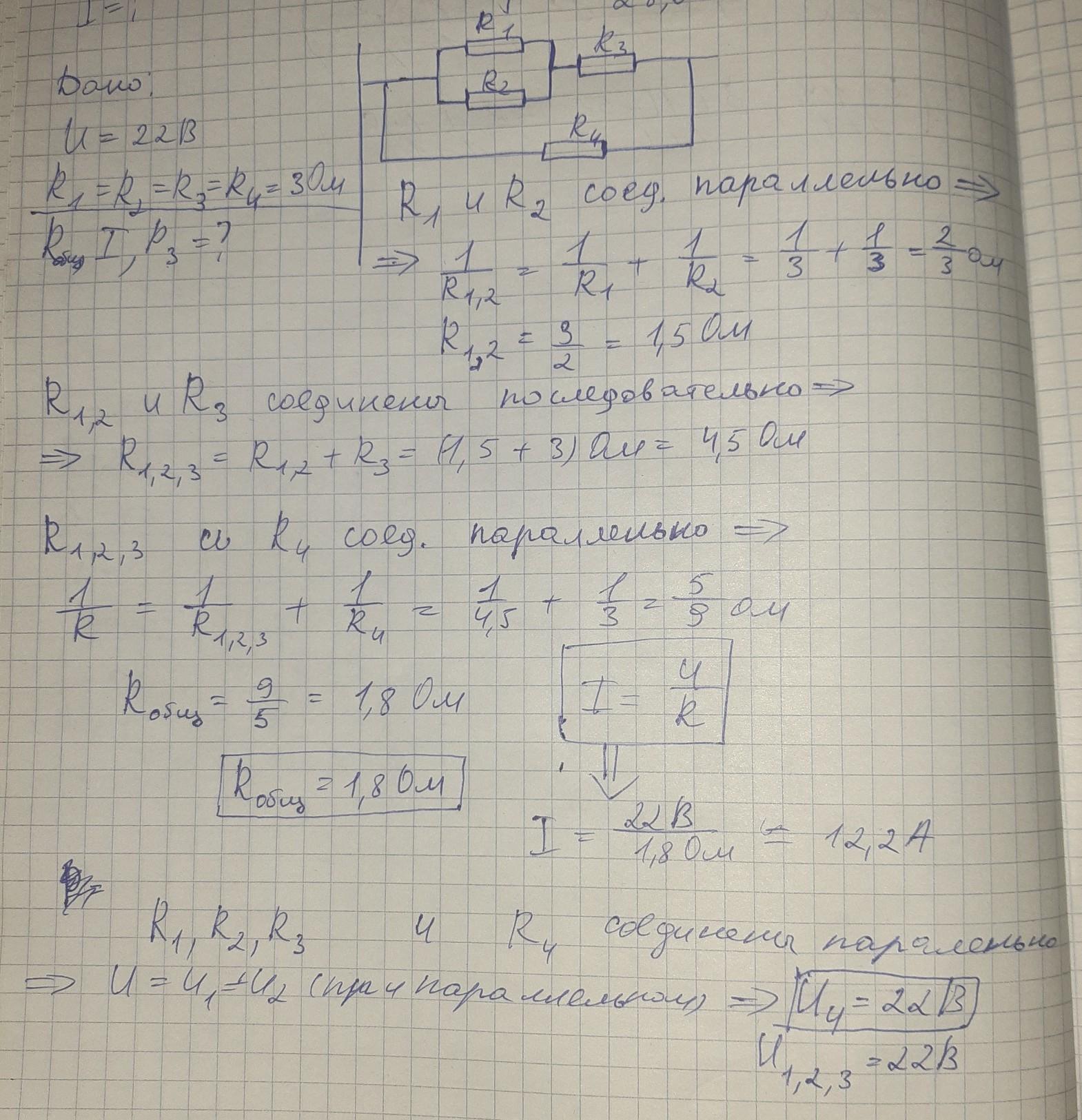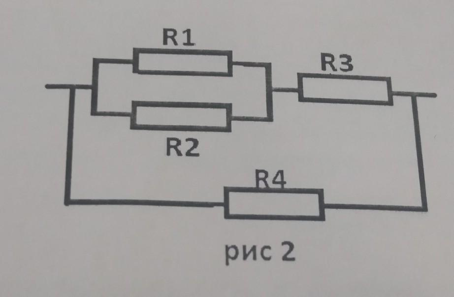 5. В электрическую цепь 22 В включены резисторы с сопротивлениями 3 Ом (рис 2). Вычислите общее сопротивление участка цепи, силу тока и мощность третьего резистора. [4] R1 R3 R2 R4 рис 2