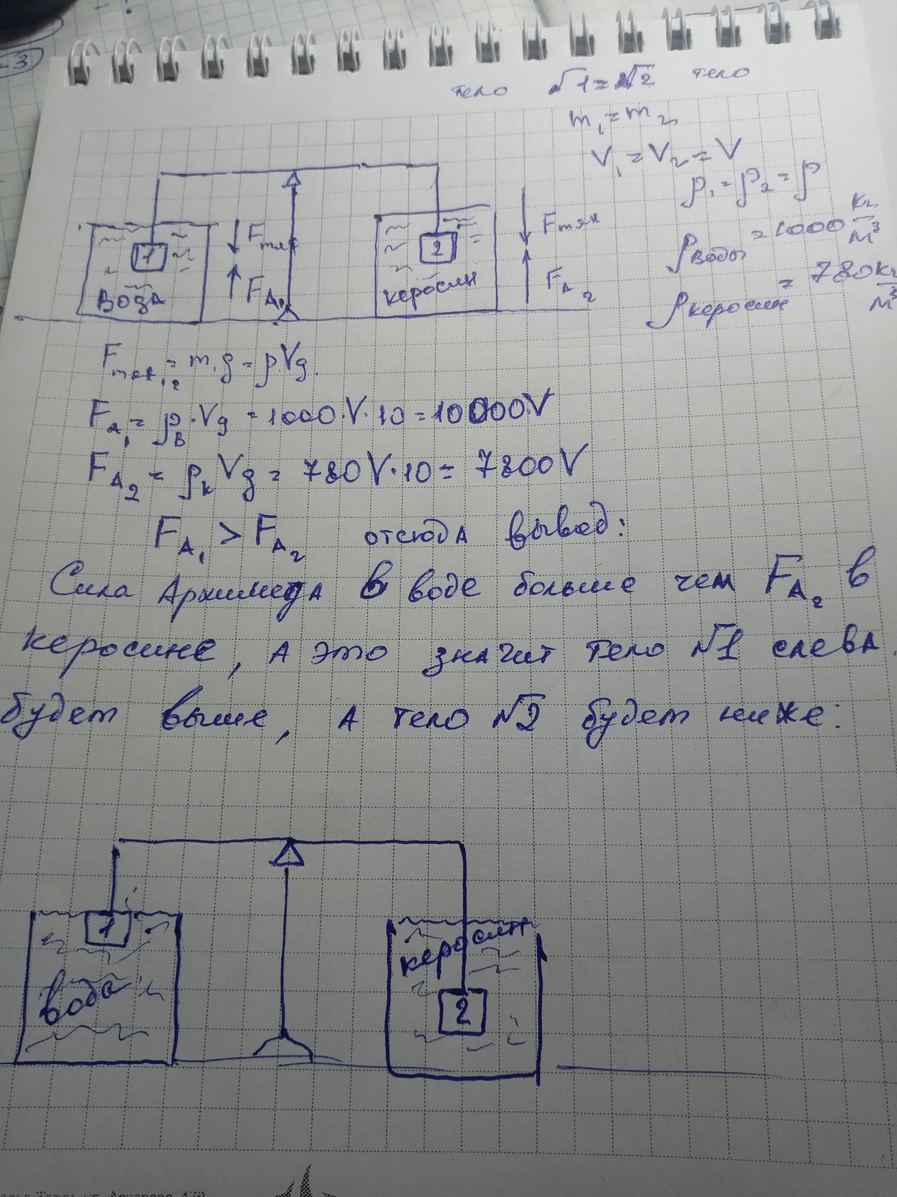 Ответ: равновесие нарушится, так как плотность воды больше плотности керосина. Тело которое в керосине будет находиться ниже тела которое находится в воде