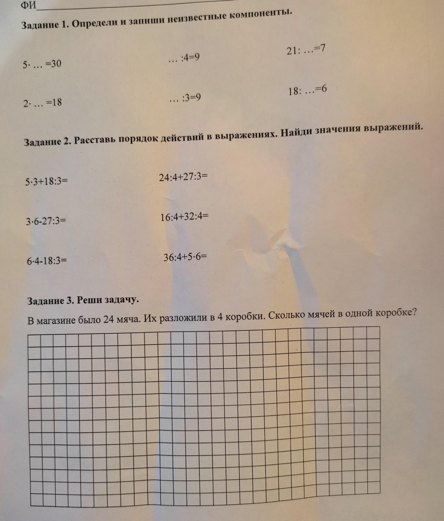 ФИ Задание 1. Определи и запиши неизвестные компоненты. 21: ...=7 5. ... =30 ...:49 18: ...=6 :3=9 2. ... =18 Задание 2. Расставь порядок действий в выражениях. Найди значения выражений. 24:4+27:3= 5.3+18:3= 16:4+32:4= 3-6-27:3= 36:4+5-6= 6-4-18:3= Задание 3. Реши задачу. В магазине было 24 мяча. Их разложили в 4 коробки. Сколько мячей в одной ?