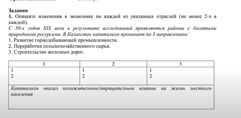 Задания 20 МИНУТ 1. Опишите изменения в жономике по каждой из указанных отраслей (не менее 2-х п каждой). С 50-х годов XIX века в результате исследований проявляются районы с природными ресурсами. В Казахстан капитализм проникает по 3 паправлениям: богатыми 1. Развитие горнодобывающей промышленности. 2. Переработка сельскохозяйственного сырья.
