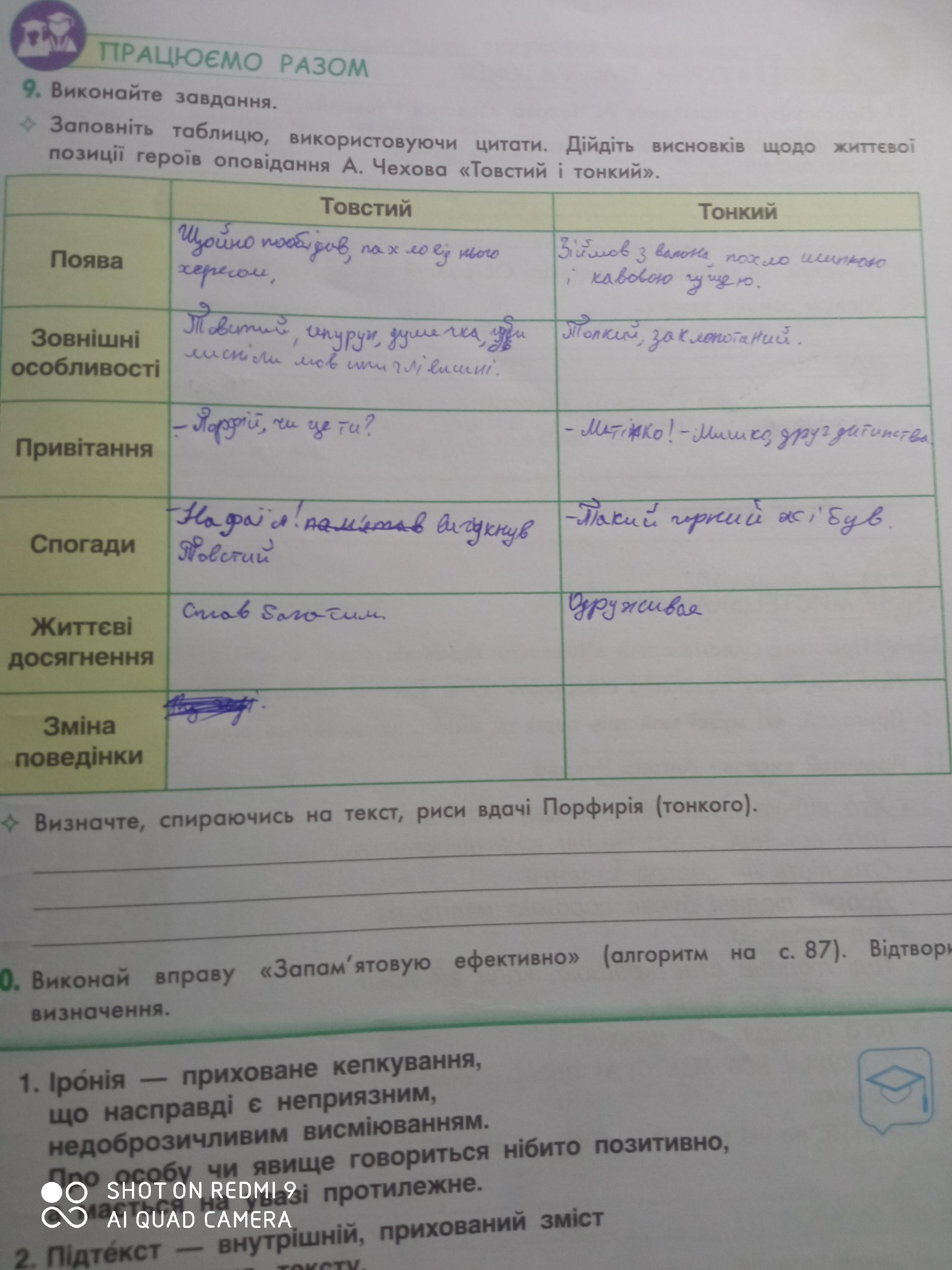 7. Виконайте завдання. - Заповніть таблицю, використовуючи цитати. Дійдіть висновків щодо життено позиції героїв оповідання А. Чехова «Товстий і тонкий».