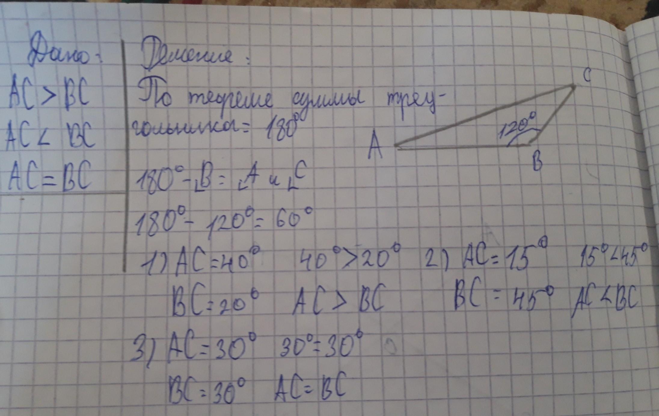 В тупоугольном треугольнике с углом АВС, равным 120 градусов, сравните длины сторон АС и ВС.